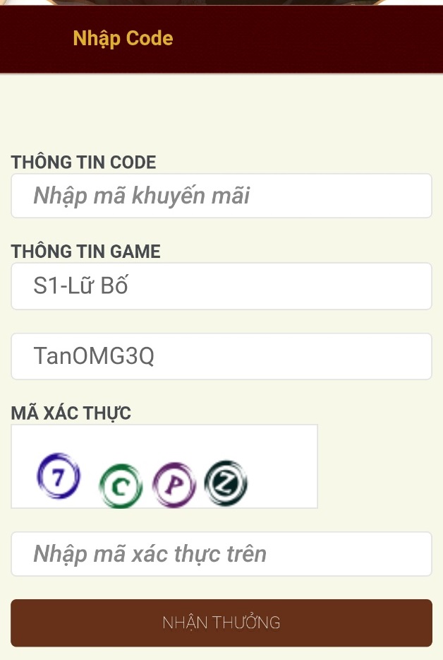 - Bս͗ớc 2: Chọn server, nhân vật –> Nhập code, mã xác thực –> Rồi bấm Nhận Thưởng.