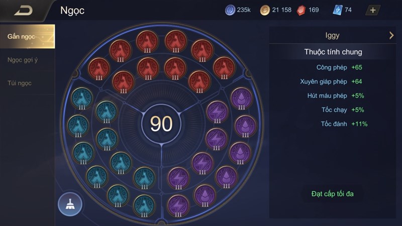 - Ngọc tím: 5 viên Công phép / Hút máu phép, 5 viên Tốc đánh / Tốc chạy.